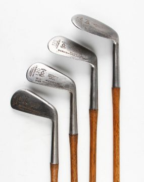 Matching set of 4x Hendry & Bishop Mitre Brand Cardinal irons - to incl driving iron, mid iron, mashie and niblick - all stamped with Fortnum and Mason Piccadilly and "120" to the heads and numbered on each sole 1- 4 - all with "The Cardinal Grip" matching full length leather grips