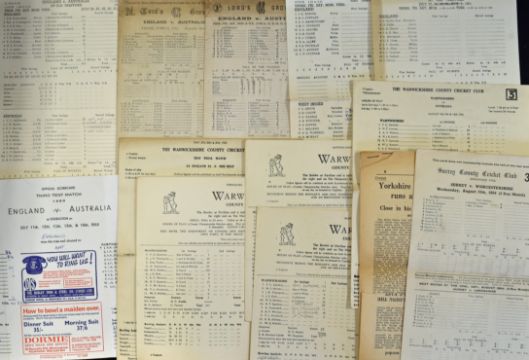 Cricket - Selection of Cricket Score Cards to include England v Australia 1934, 1948, 1956, 1961 and 1968, England v West Indies 1963, England XI v The Rest 1953, plus Warwickshire v Australia 1952 and 1953, and Surrey v Worcestershire 1954, and Lancashire v Yorkshire 1958 - pencil to most, marks and creases as expected but overall condition is A/G (12)