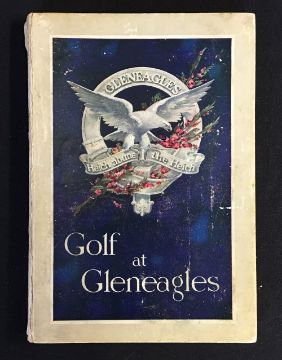 Gleneagles Golf Book - by R.J Maclennan titled - 'Golf at Gleneagles' - published by McCorquodale, Glasgow, 1st ed 1921, illustrated boards, minus cover to the spine 144p, c/w numerous photographs of the course together with the original folding out hand coloured plan of the golf course with vignette of James Braid - some slight wear to the front cover and minor bruising to the corners, some scuffing to the front free end plate, owners name written to the top left hand corner of the main titled page - otherwise internally very clean hence overall (G)
