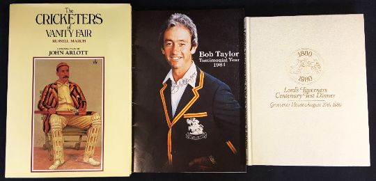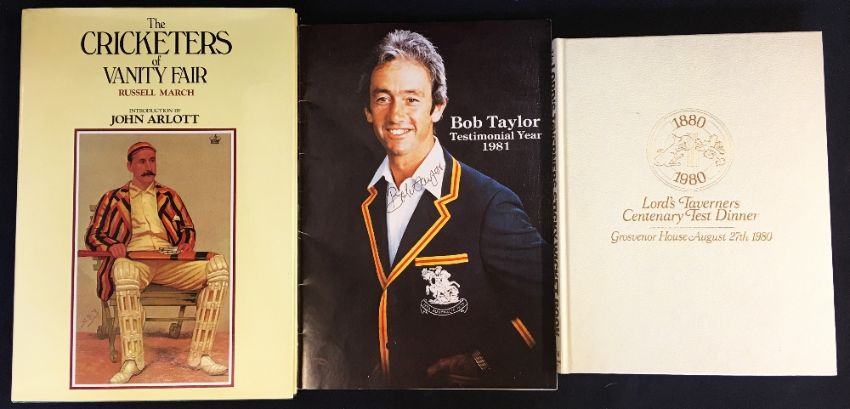 Cricket - Signed The Lord's Taverners Sticky Wicket Book signed to inside page by the England team, together with Bob Taylor Testimonial Year 1981 booklet, signed to cover by Bob Taylor and The Cricketers of Vanity Fair hard-back book by Russell March with dust jacket. (3) From the personal collection of Bernard Thomas, who was the physiotherapist for the England team between 1970 and 1985.