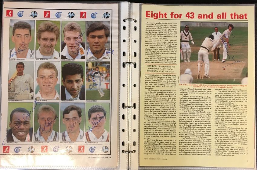 Cricket - England Test Cricketers Signatures plus county and other players, signed magazine covers, newspaper and magazine cuttings including Dennis Amiss, Michael Atherton, Graham Gooch, Geoff Boycott, David Gower, Allan Lamb, Viv Richards, Phil Defreitas, Jack Russell, Mark Ramprakash, Alec Stewart, Phil Tufnell, Mike Gatting, Mike Atherton, Nasser Hussain, Angus Fraser, Angus Fraser, Matthew Maynard, Dominic Cork, Stuart Law, John Crawley, Andrew Flintoff, Keith Piper, Richard Green, Melvyn Betts and others, mostly 1990's with some earlier, approximately 178 total, all housed in 3 folders.