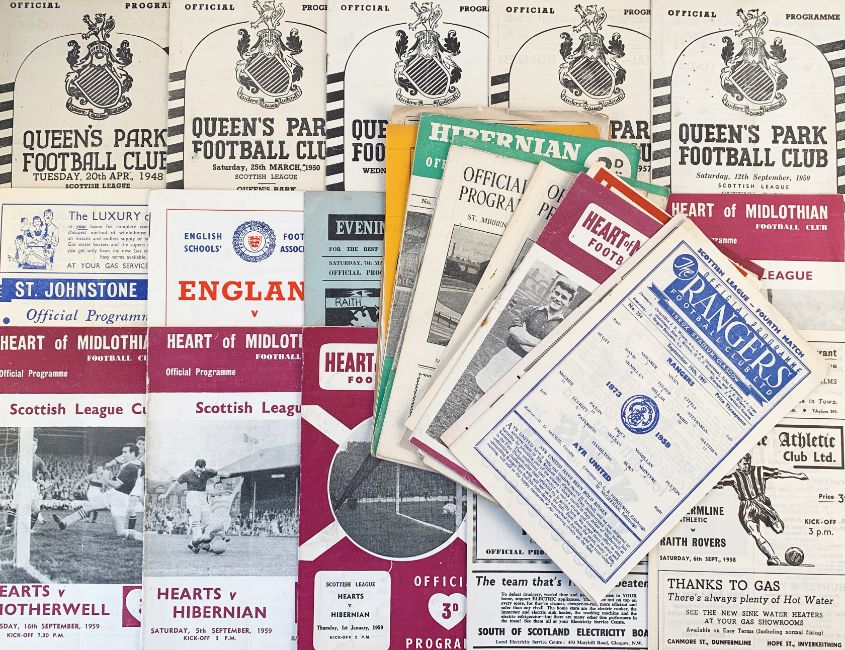 1950's Scottish match programmes including 1947/1948 Queens Park v Airdrie, 1958/1959 Hearts v Hibernian, Partick Thistle v Hibernian, Dunfermline Athletic v Raith Rovers, 1959/1960 Rangers v Ayr Utd, 1956/1957 St. Mirren v Airdrie, Falkirk, Queen of South, Dunfermline Athletic, 1957/1958 Kilmarnock v Queens Park, Hibernian v Kilmarnock, Dundee Utd v Brechin City, 1954/1955 Scottish League v League of Ireland plus others. (39) Fair-Good.