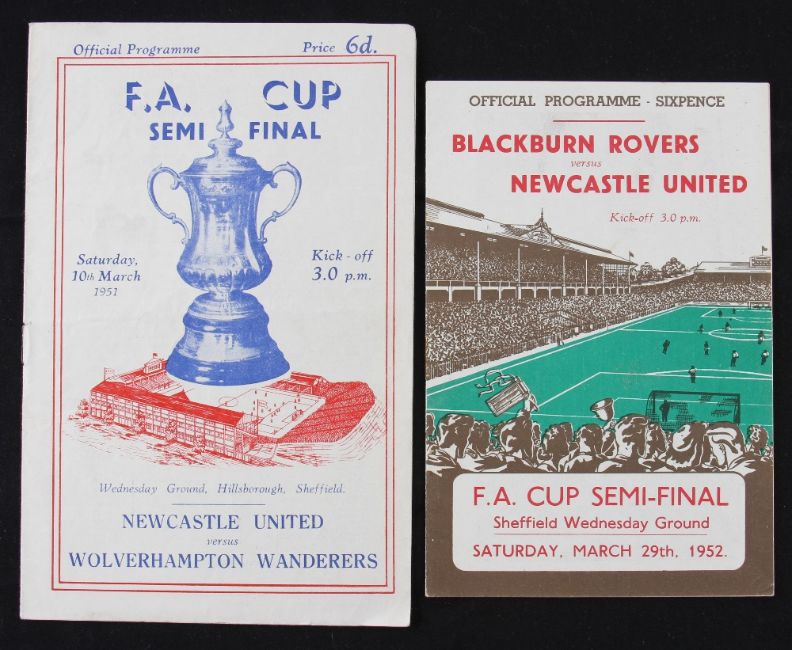 FA Cup semi-final match programmes 1950/1951 Newcastle United v Wolverhampton Wanderers, 1951/1952 Blackburn Rovers v Newcastle United. (2) Good.