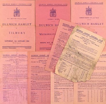 1947/1948 Dulwich Hamlet match programmes v Tilbury (FA Amateur Cup), Metropolitan Police (friendly), Hendon (London Senior Cup) and reserve issues, v Wimbledon, Walthamstow Avenue, Woking, Ilford, Corinthian Casuals, Leytonstone. (9)