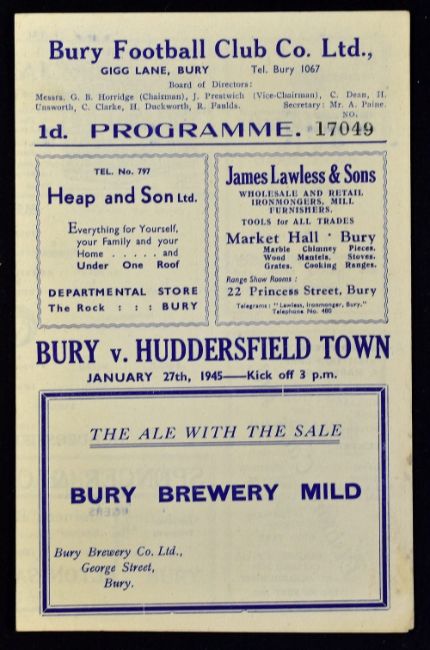 1944/1945 War League North Bury v Huddersfield Town match programme Good.
