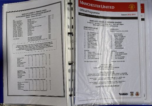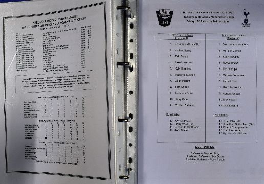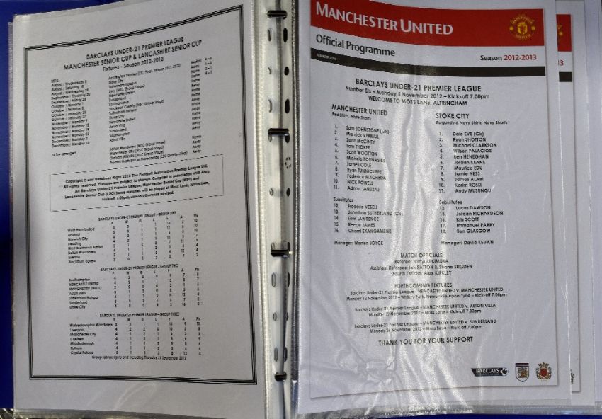 Manchester Utd modern team sheets and menus, homes and aways, European, Premier League, under 21's and 18's. (1 binder) Condition is good to very good, worth a view.