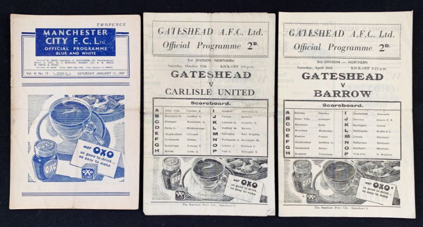 1946/1947 Gateshead home match programmes Barrow, Carlisle utd and away at Manchester City (FAC) (3) Fair-Good.
