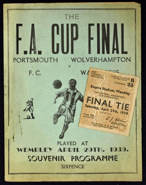 1939 FA Cup Final Portsmouth v Wolverhampton Wanderers at Wembley 29 April 1939 large souvenir (pirate) programme, light green cover, publisher not named. Also official cup final ticket for east standing enclosure. Fair-Good. (2)