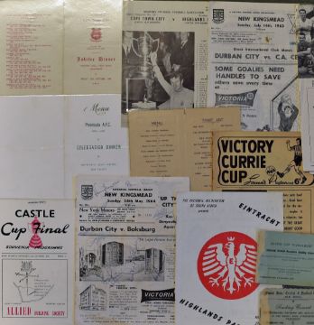 Currie Cup Football Ephemera to include 1946 Souvenir Programme with autographs, 1923 Dinner Menu, 1908 Smoking Concert ticket at the Wanderers, plus 1963 Durban City v CA Cerro (Uruguay) match programme, 1906 Smoking Concert ticket at Marist Bros, Johannesburg, 1960 Castle Cup Final, 1970 Cape Town v Highlands Park, 1967 Peninsula Celebration dinner menu, 1948 Clyde Ath. Club jubilee dinner menu, 1963 South Africa v Tottenham Hotspur (cover missing) and 1964 Eintracht v Highlands Park, condition mixed F/G (12)