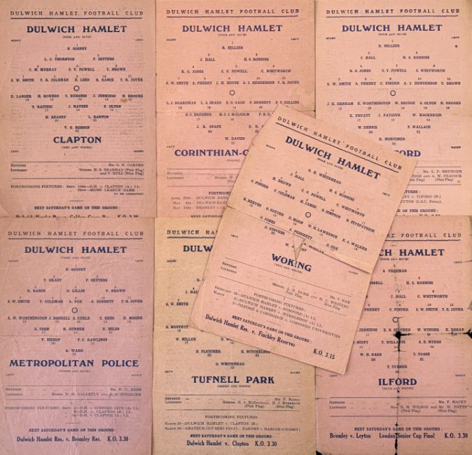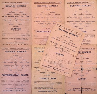 1945/1946 Isthmian League Dulwich Hamlet match programmes v Clapton, Corinthian Casuals, Romford, Tufnell Park, Metropolitan Police, Ilford, Woking, all single sheets (7) Condition is varied, some good, view to assess.