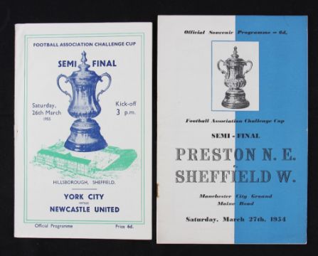 FA Cup semi-final match programmes 1953/1954 Preston North End v Sheffield Wednesday, 1954/1955 York City v Newcastle United. (2) Good.
