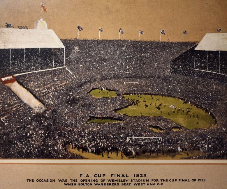 Rare 1923 FA Cup Final Bolton Wanderers v West Ham Football Print a colour print from the original by William Reginald Howe Browne (1897-1992), notes to the reverse explaining how the artist came to paint the original which is housed at the National Football Museum, previously held at Wembley Stadium. Text to the mount 'FA Cup Final 1923 The occasion was the opening of Wembley Stadium for the Cup Final of 1923 when Bolton Wanderers beat West Ham 2-0, framed measures 66x5cm approx.