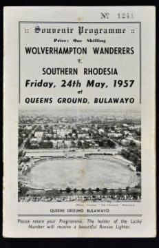 1957 Southern Rhodesia v Wolverhampton Wanderers match programme at Queens Ground, Bulawayo with team sheet insert 24 May 1957. Fair-Good.