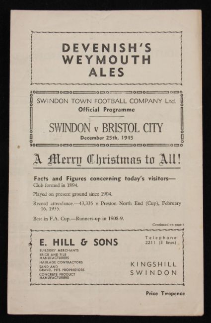 1945/1946 War League Swindon Town v Bristol City match programme Xmas Day 1945, 4 pager. Fair-good.