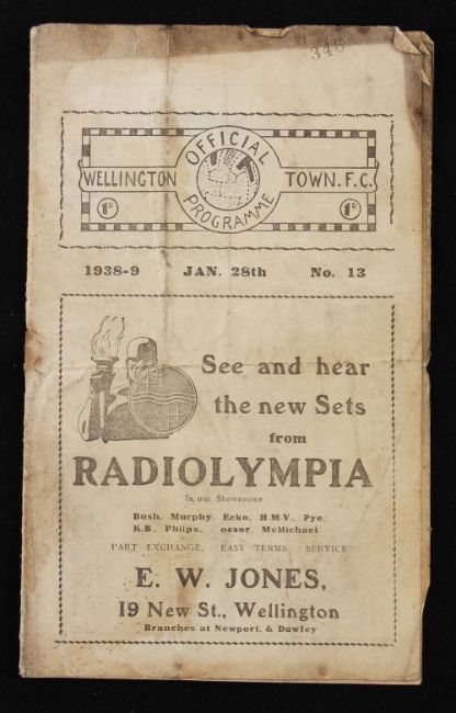 Season 1938/1939 Wellington Town v Whitchurch Shropshire Senior Cup semi-final 28 January 1939 match programme. Fair at best, view to assess this scarce item.