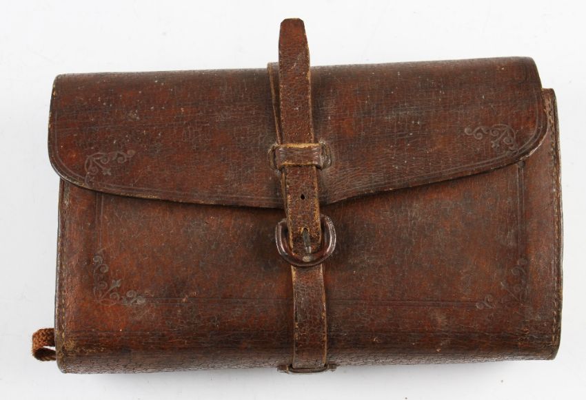 Late 19thc Farlow's 191 The Strand large leather fly wallet - with makers oval gilt stamp mark to the inside and, various parchment and cloth pages-original leather strap and owners name and initials embossed to the back panel