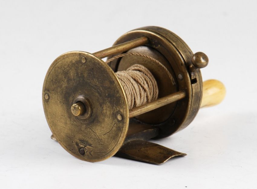 Early c1820 Haywood Birmingham Maker all brass multiplier pin stop winch, 1.5" diameter, 1.75" wide, lever lock to raised front housing, curved wincing arm, polished bone handle, original pillars and screws, good original lacquer finish.