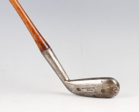 Spalding Bros Patent Cran cleek iron c.1897 - the wooden face insert retained by 2x screws, head stamped with makers details and Patent date June 8th 1897 c/w makers shaft stamp below the original thick hide grip with underlisting
