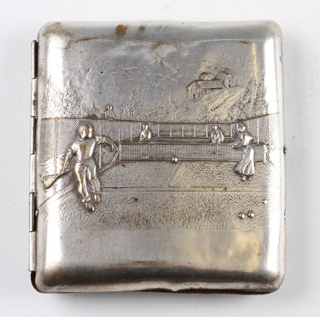 Silver plated tennis design cigarette case - With early tennis scene to front and flower design to rear