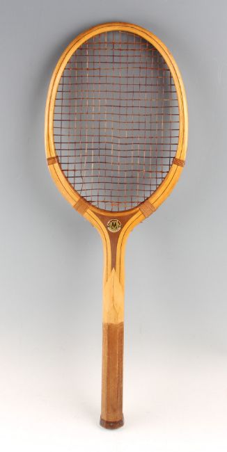 The Driver wooden tennis racket with concave throat with original natural gut stringing. by N. I. Magnan Corp Attleboro Mass USA