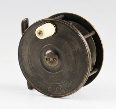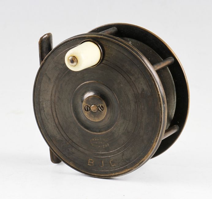 Fine Macleay, Inverness all brass wide drum salmon fly reel, 4" diameter, ivorine handle, 2x screw face plate fixing with makers stamp, original screws pillars and foot, retains most original bronzing, having owners initials engraved to face