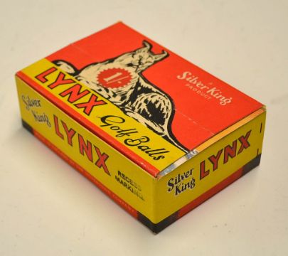 1930's Silvertown Golf Ball Box and Golf Balls - "The Silver King Lynx" Golf Ball Box c/w 6x wrapped recessed golf balls featuring pop up Lynx on front with lift up lid c/w original paper wrapped golf balls and period Christmas Greetings leaflet and still has The Silvertown Coy seal to the base 13 x 9cm
