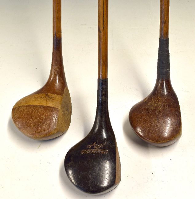 3x assorted socket woods - large brassie stamped Ernest Norman Carlyon Bay GC: J H Taylor autographed brassie with shaft stamp together with an R Forgan St. Andrews Scotia brown stained driver (3)