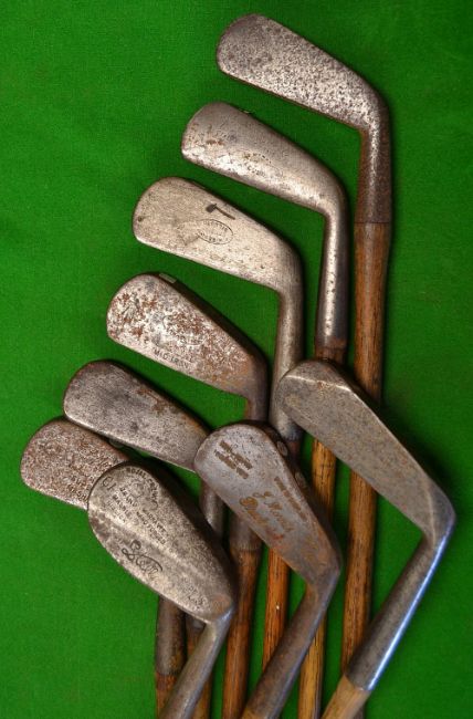 9x various golf clubs - T Tait cleek, Super mashie, mid iron, Stella Royal crown mashie niblick, 2x Tom Stewart irons, J Morris Prestwick mid iron and Mitre Model putter with chamfered heel and toe et al