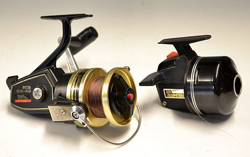 Abu and Ryobi spinning reels (2) - Abumatic 350 closed face button reel (VG) and Ryobi GX-40 automatic/manual pick up, left or right handle - well-kept reel (G)