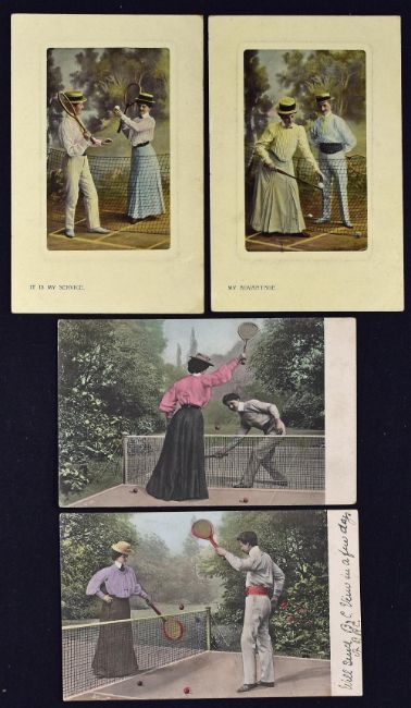 2x The Milton 'Glazette Sunk Mount' Tennis Postcards includes an interesting selection of postcards with 'My Advantage' and 'It is my Service' series No147 plus M Ettlinger & Co Tennis Postcards - all in colour and depict couples playing Tennis, in good condition (4)