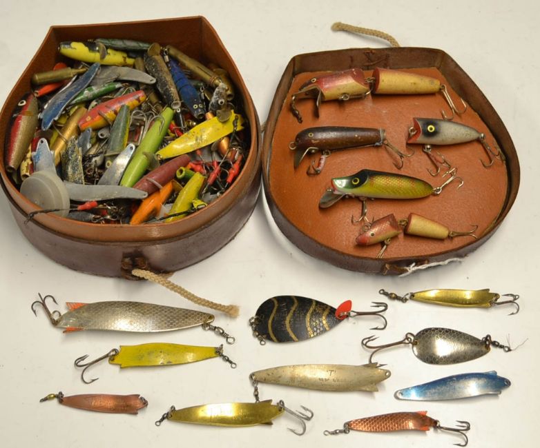 Large quantity of salmon lures including Devons, Abu Toby's, Hardy HJS, Allcock's wooden plug, spoons et al contained within a large horse shoe shaped leather box (A lot)