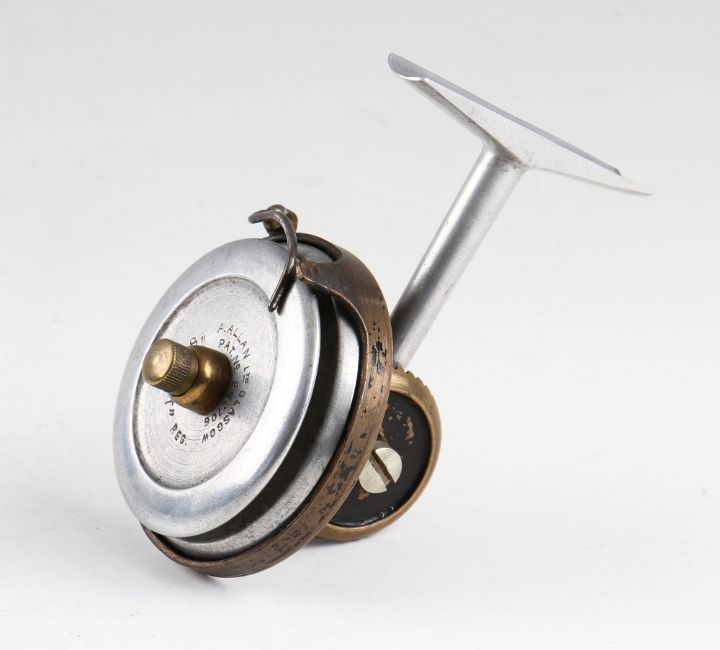 Arthur Allan Glasgow Spinet early thread line casting reel: Alloy spool flier and gearing, half bail, RHW model, pat No 262706 in good working order.