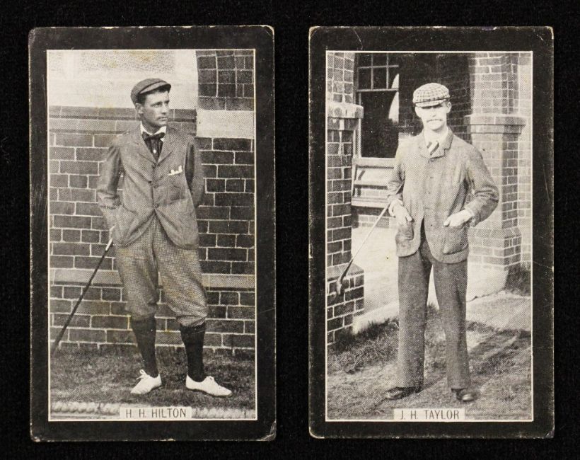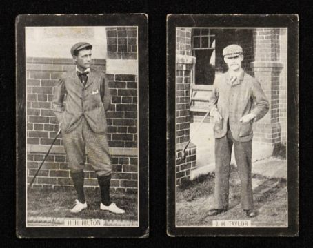 2x F&J Smith's "Champions of Sport" golfing cigarette cards c.1902 - blue backs unnumbered, real photographs of Open Golf Champions J.H Taylor and H.H Hilton - corners very lightly bumped, and some slight soiling to backs nevertheless (G)