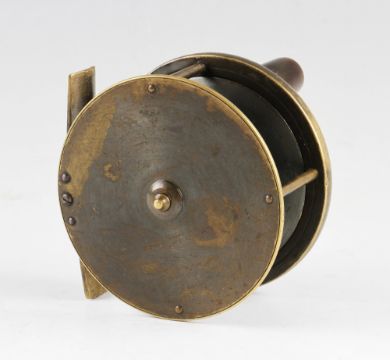 Interesting Eaton & Deller brass salmon reel - 3.25" dia and engraved with makers details, and 6&7 Crooked Lane London Address and Established Five Centuries engraved to the face - runs well
