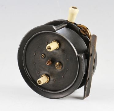 Westley Richards The Rolo: 3.75" Silex pattern casting reel, factory quarter rim cut out, ivorine/bone handles, rim tension adjuster, correct smooth brass foot, roller drag system to ivorine knobbed lever, internally stamped "Patent No 20133", retains most original dark lead finish