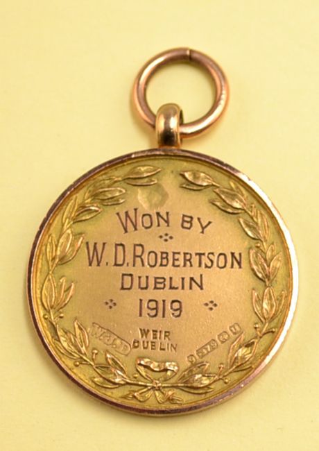 1919 Irish 9ct gold winners golf medal - engraved on the reverse "Won By W.D Robertson - Dublin-1919" and on the obverse embossed with two crossed golf clubs golf ball and initials B.T.H - hallmarked Birmingham 1919 - wt 8.2 gm