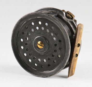 G Little & Co reel c.1900: 2.75"63 Haymarket London alloy reel, smooth brass foot, bone handle - some minor knocks to rims.