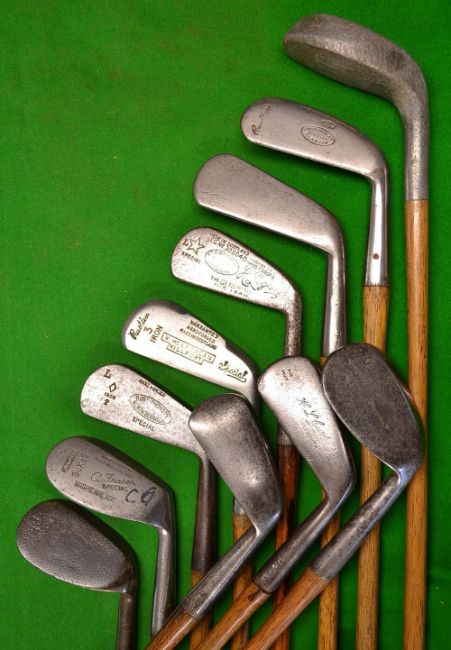 Assorted Golf Clubs (10) - incl 2x niblicks, mashie niblick stamped Suxes, Winton 2 iron, Mussel back 3 iron, round soled mid iron by Nicoll together with a Braid Mills alloy putter (11)