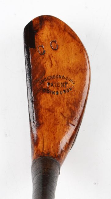 Interesting and rare Anderson & Son Edinburgh Patent golden beech wood transitional head with early socket bore thro neck - with three quarter leather face insert and replaced period hide grip with underlisting - overall length 44"