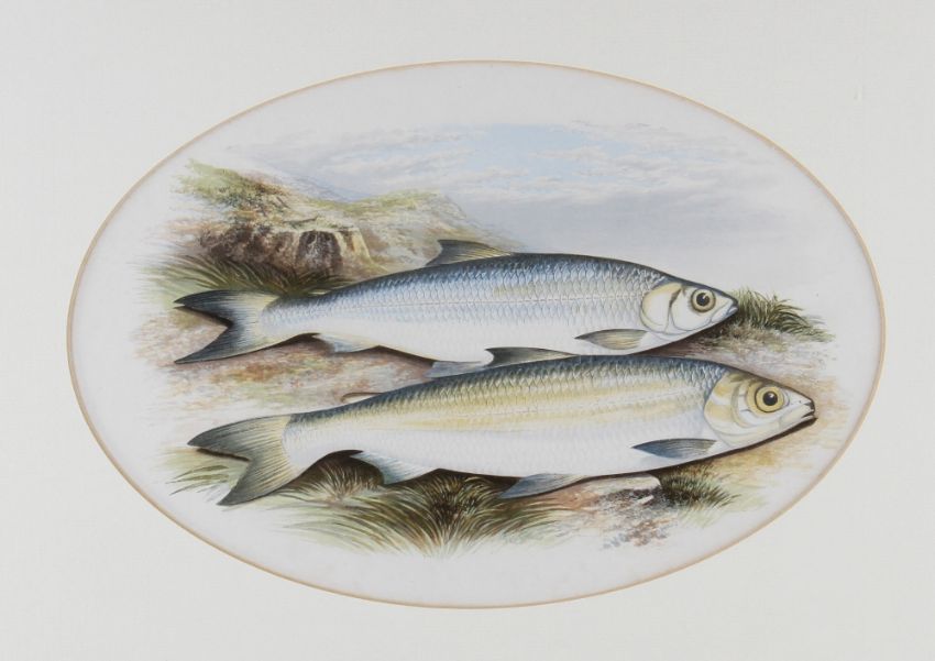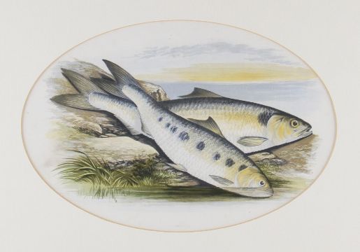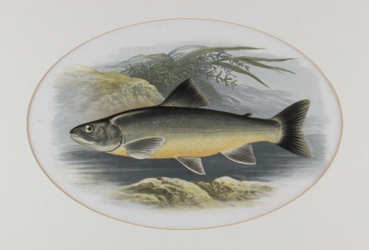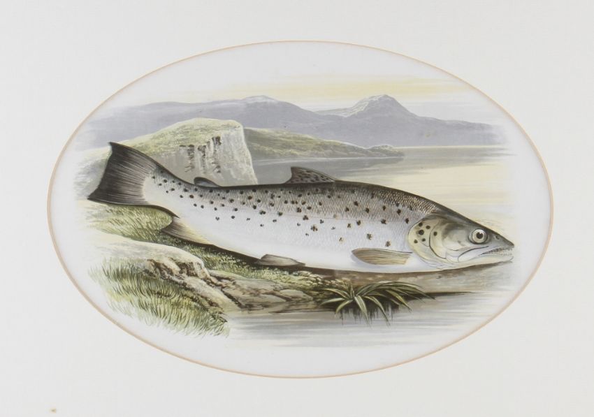 Rev W Houghton "British Fresh Water Fishes" - collection of 7x original fishing coloured plates drawn by A.F Lydon publ'd 1879 to incl The Main title page and 7x various other coloured plates of both Game and Coarse Fish to incl Arctic Char, Allis Shad, Twaite Shad, Sea Trout, Salmon et al- all featuring oval mounts and matching gilt frames - overall 15.5 x 19" (8)