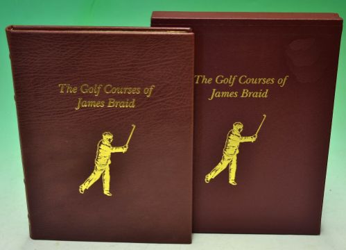 Moreton, John F signed - "The Golf Courses of James Braid" 1st ed 1996 Author's ltd ed no 78/85 bound in full dark brown Morocco and gilt pictorial leather boards and ribbed spine signed by the author to the limitation page, c/w Gleneagles and Royal Blackheath Golf Club plans, folded and retained to the rear end plate - comes with the publishers slipping label confirming limited edition numbers increased from 75 to 85 and complete with matching pictorial gilt slip case (G).