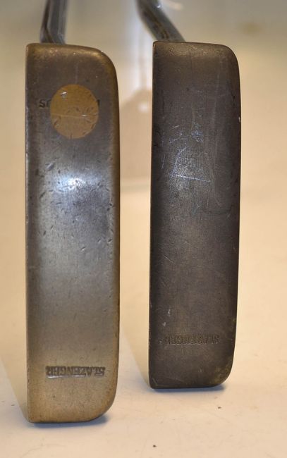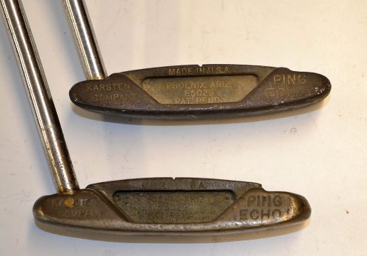 2x Ping Echo Putters with Phoenix Arizona Address - one stamped Slazenger to the sole, the other a Jack Nicklaus with re-shaft repair to the sole, stamped Slazenger to the toe end, both fitted with replacement grips