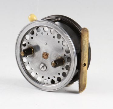 Hardy The Super Silex Salmon Reel: 3.75" diameter wide drum alloy casting reel, twin black handles, button release, correct ribbed brass foot, Ivorine trigger knob, rim tension adjuster with ivorine half-moon scale - runs well