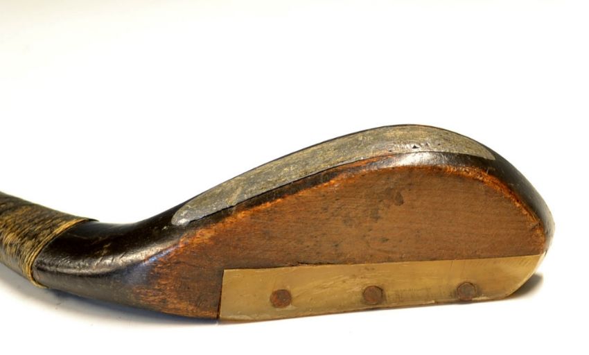 Tom Dunn longnose beech wood curved face driver c.1880 - retaining most of the fine original light tan hide grip with thick underlisting - head measures 5.5 x 1.75" x 1 1/8" - overall 44"