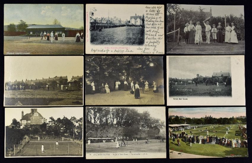 Tennis Postcard Selection to include various topographical postcards featuring 'Battersea Park, 'Lenzie', 'Park Hall', 'Cheltenham', 'Manor Farm Caldecot', 'Devonshire Park Eastbourne', 'Forest Hall' and more, condition overall appears A/G (15)