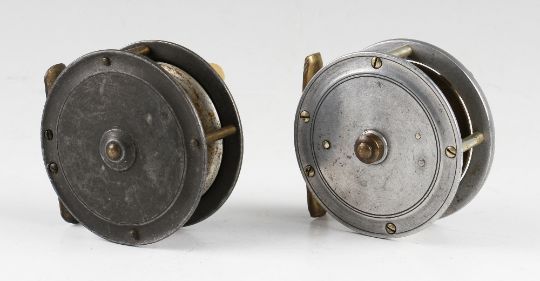 Armstrong & Co Reel Newcastle on Tyne: Brass and Alloy 2.75" fly reel, brass foot together with alloy with brass face 3" reel having stork logo on face both run well (2)