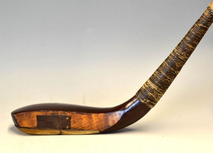 Hugh Philp fruit wood longnose hook faced spoon c.1840 - with small rectangular inlaid face insert, original horn sole insert - with replaced thick hide grip with underlisting - head measures 5.75"x 1 5/8" x 1" - overall 41.5" long - a small circular lead weight has been added to the club - quite stunning high quality period golf club. Note - this club is listed and illustrated in Robert Gowland Book "The Oldest Clubs 1650-1850" see page 97.