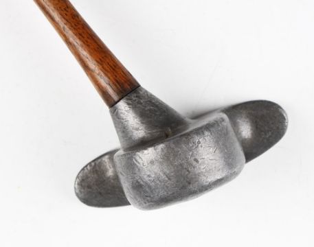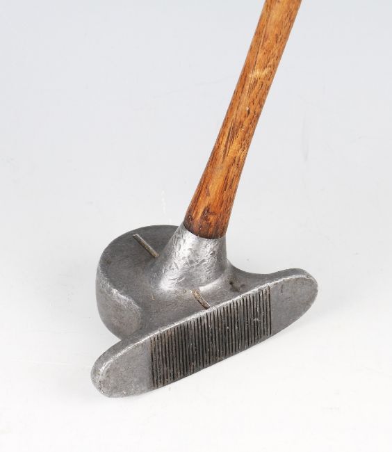 Very unusual unnamed bulbous round backed forward face alloy centre shaft putter with fine line face markings, top aiming line and full-length leather grip - most unusual