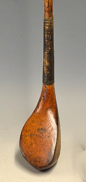 Early R Forgan St Andrews heavily bulged golden beech wood driver c.1890 - showing makers mark and powf to the crown and makers shaft - fitted with fine original thick hide grip