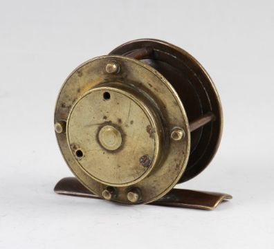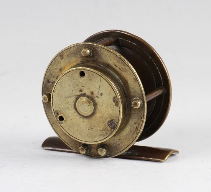 Scarce Bowness and Bowness 230 The Strand 2.25" brass crank wind trout fly reel c. 1860 - with curved crank arm, turned bone handle, raised check housing (missing 2x screws) - good strong check.